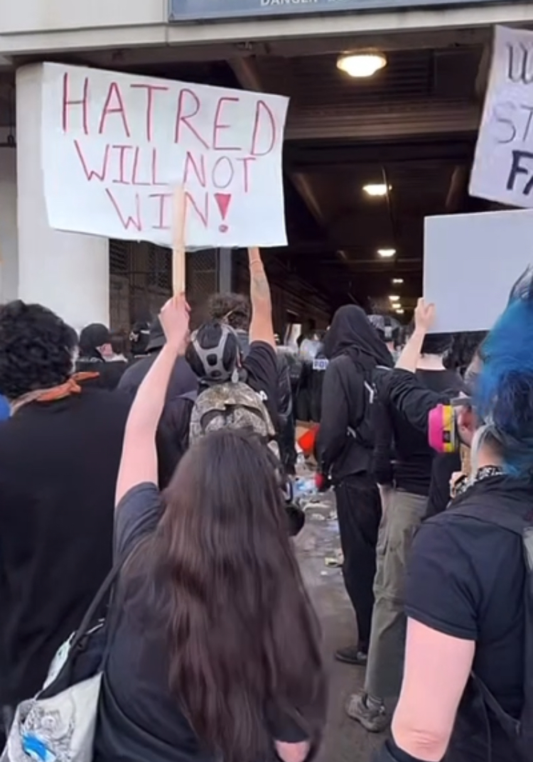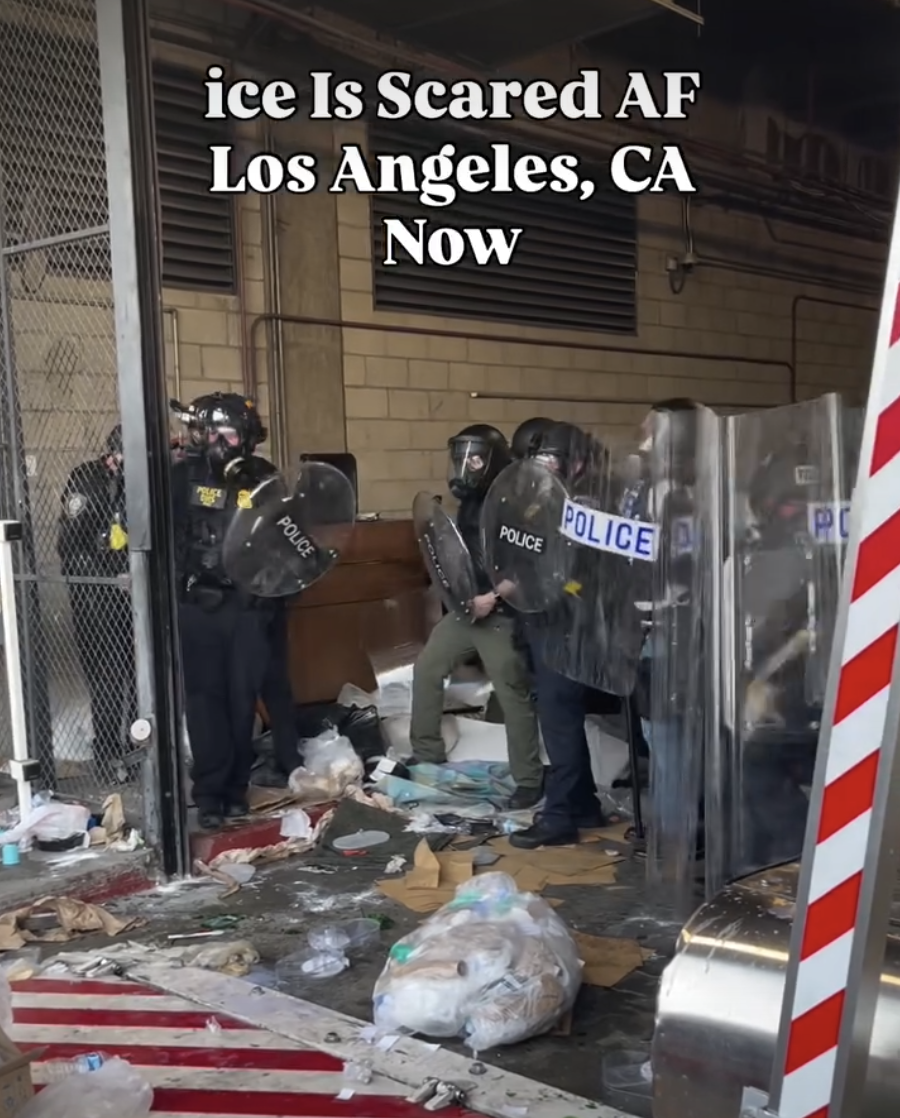 dhs police being pushed back by protesters at downtown la detention center. ice out of la protests going on now! ..