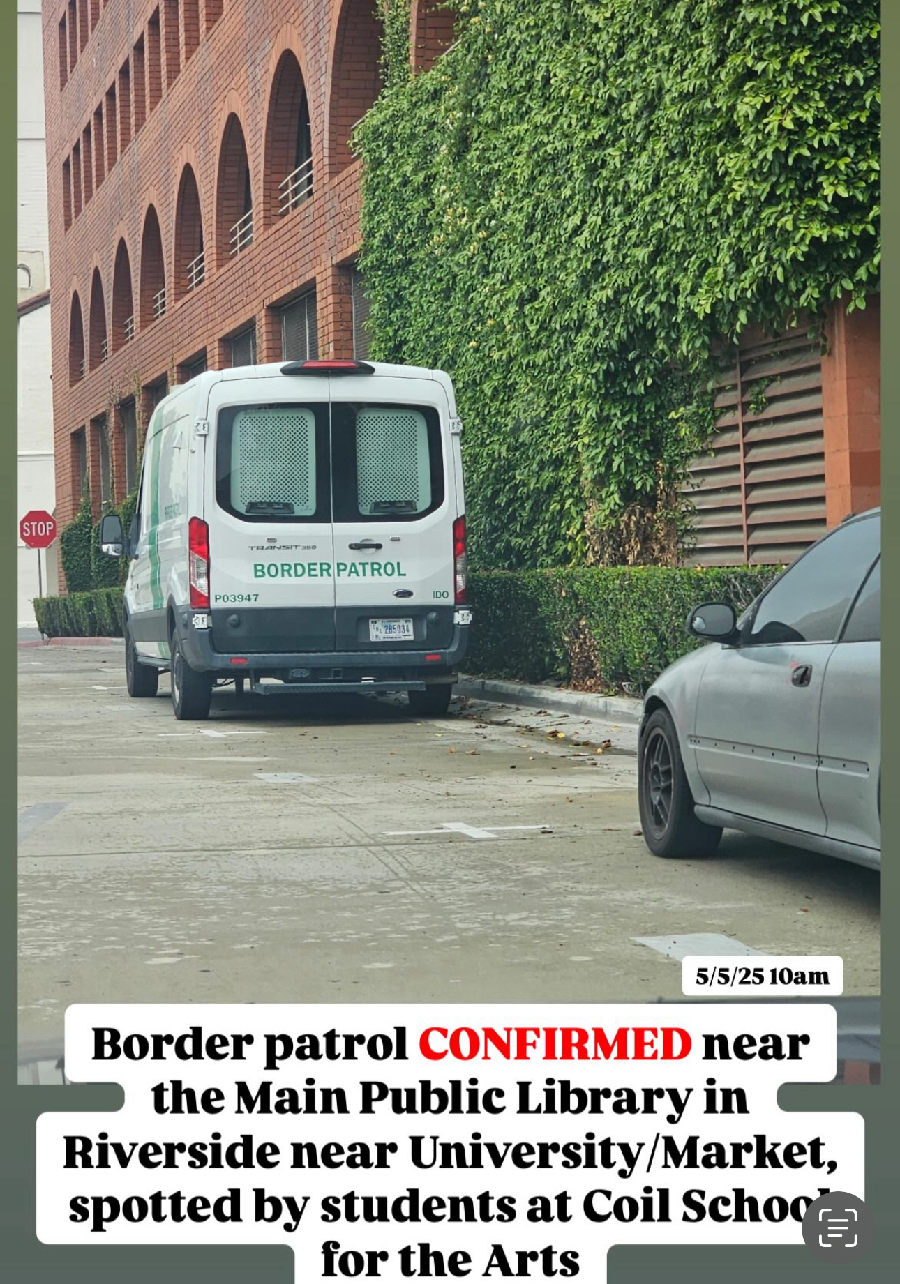 border patrol vehicle spotted on the side of this building by the main library. however , homeland security regularly patrols the federal building right next to library , previous years back i spoke to a homeland security vehicle there and they stated there is a federal building and theyre not there for immigration.