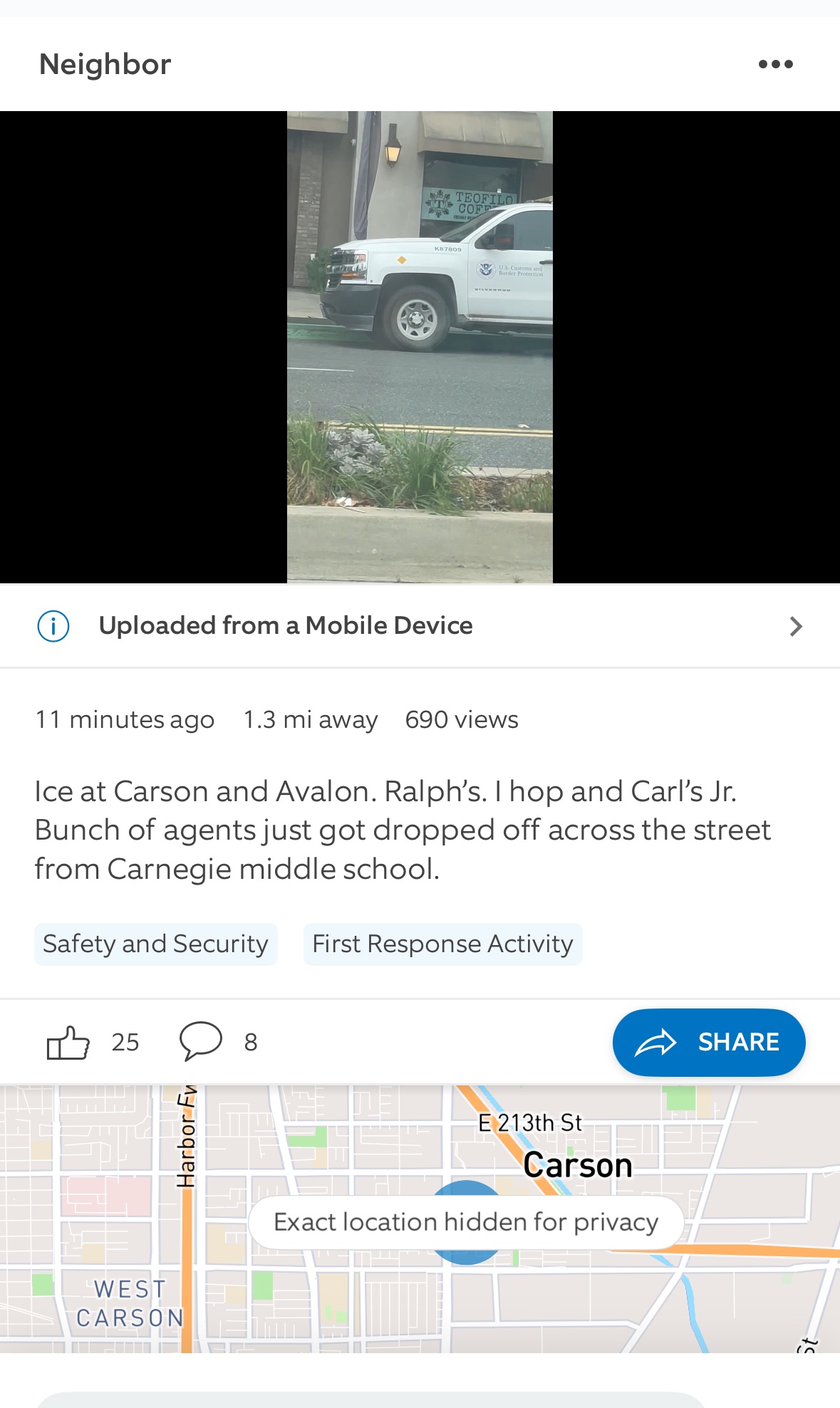 ICE agents at Carson and avalon , a bunch of agents just got dropped off across the street from Carnegie middle school