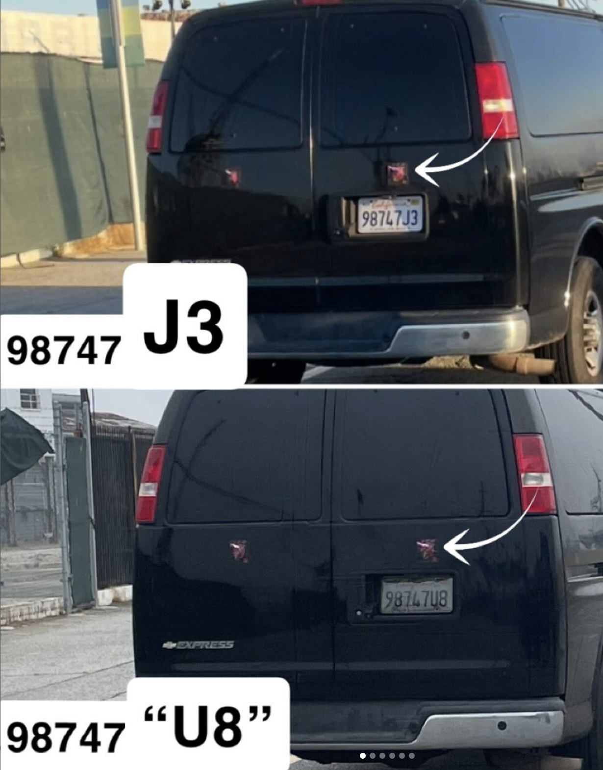 Van used by SRT kidnapper unit is using black marker to alter license plate number from 98747J3 to 98747U8. Morning of 11/4/2025