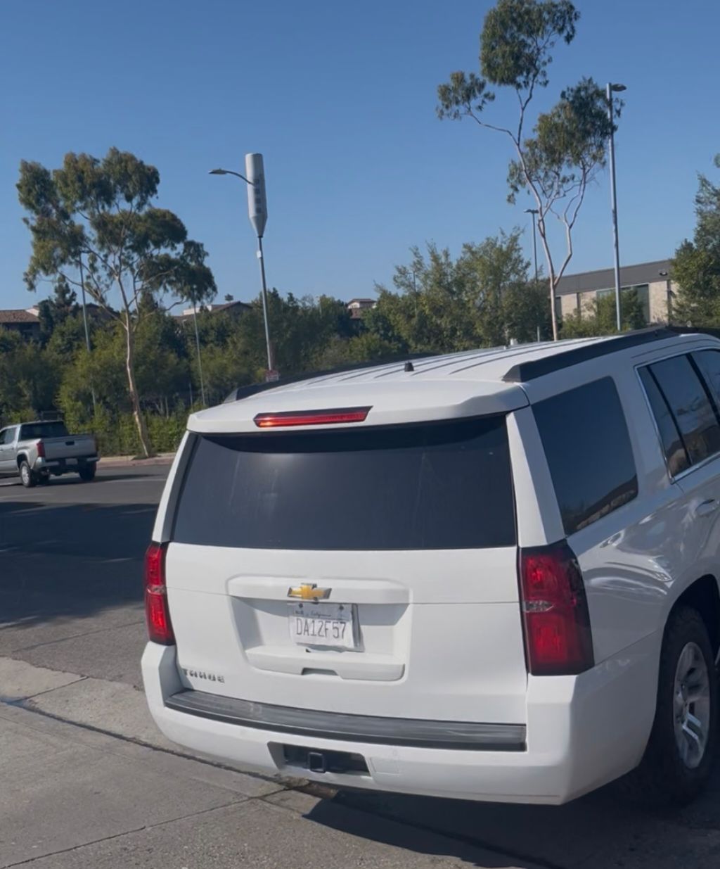 Agents in these two Chevy Tahoe’s left the Terminal Island ICE / border patrol staging area on 8/4/2025 at 8:48 and 8:49 am. Both had the same plates. - documented by Harbor Area Peace Patrols