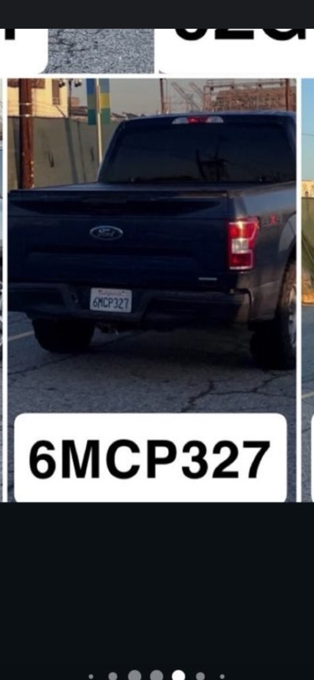 Dark blue truck, tinted windows, CA license plate, rear has a line scratched next to the Ford logo