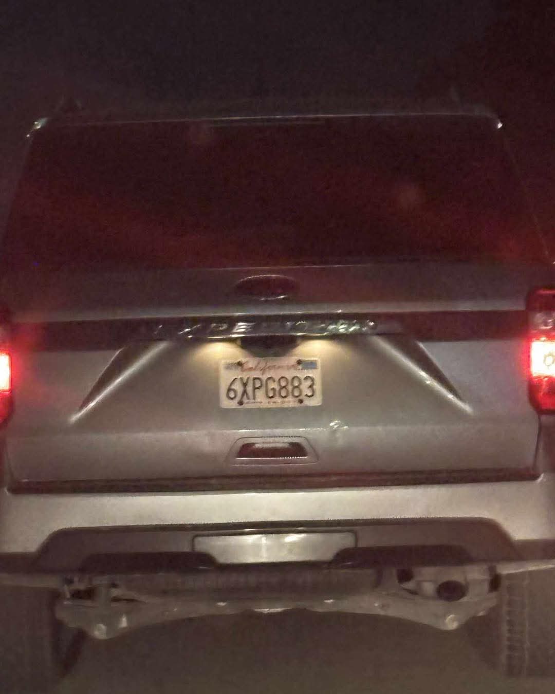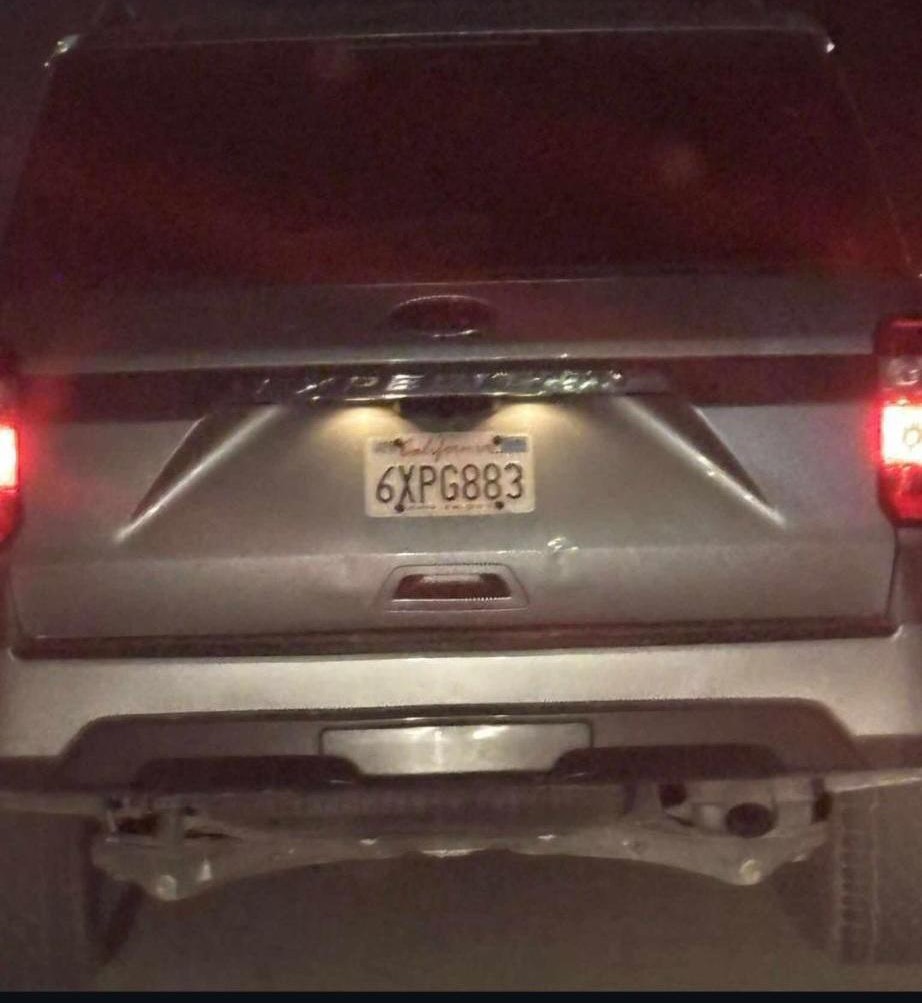 Silver SUV, tinted windows, dirty, rear left bumper un even, seen in San Bernardino