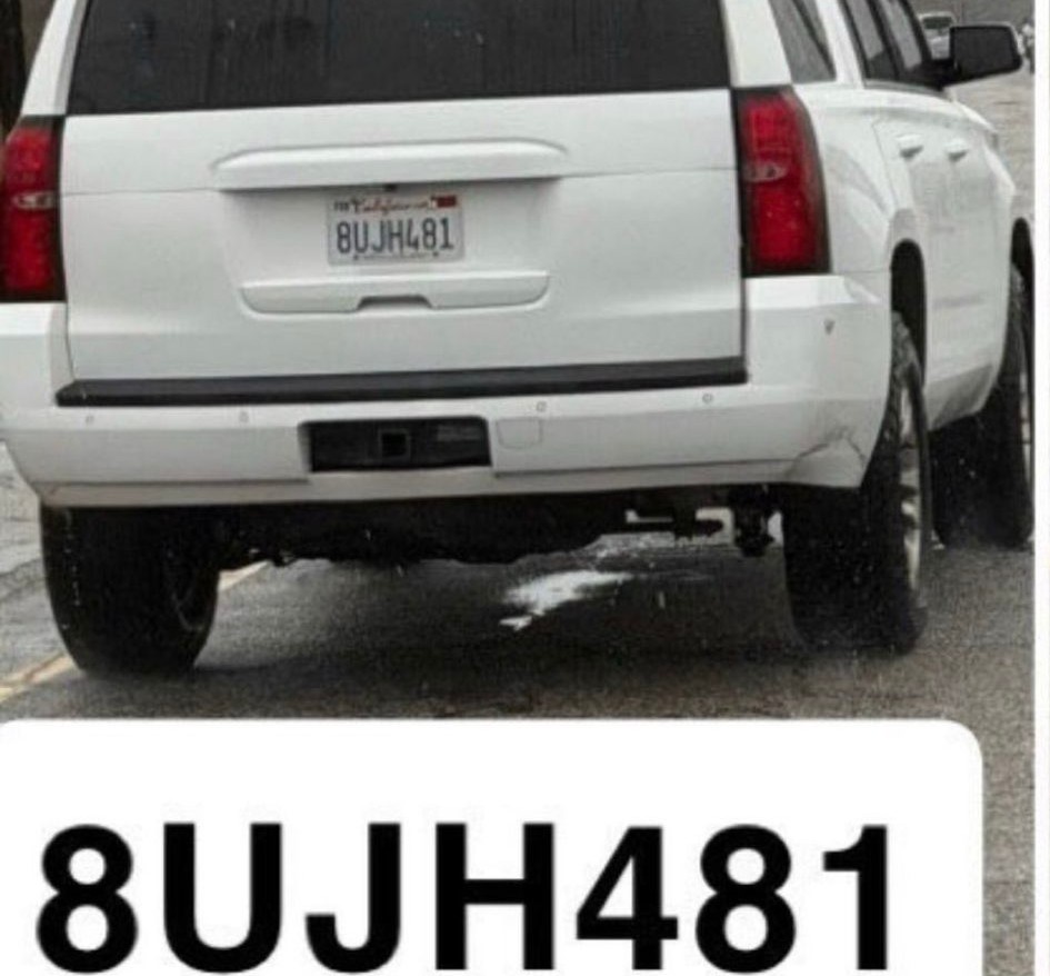 White SUV, tinted windows CA license plates, no logos in the rear, right bottom bumper near the tire is dented