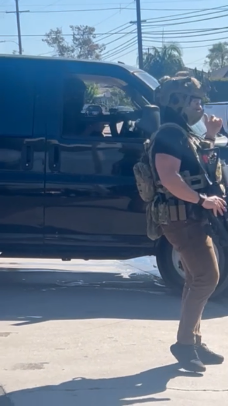 ICE Agents/Bounty Hunter Seen Pointing Automatic Weapons at people protesting and recording outside a grocery Stop at Tustin & 17th