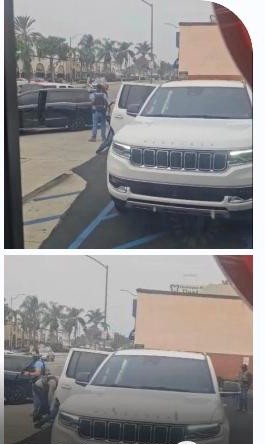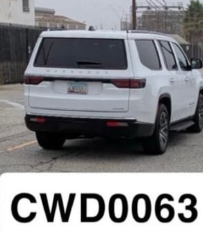 White SUV, tinted windows, Arizona license plates , no front plates. Mask and vest on man with gun pointing.